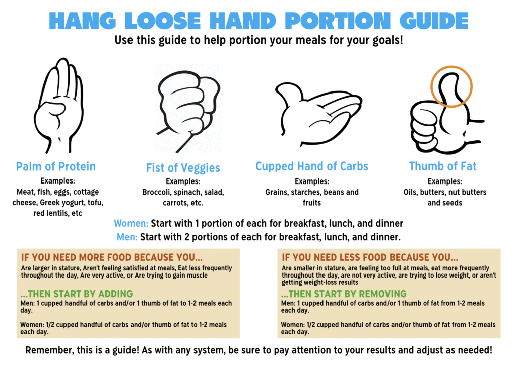 Eating for Health and Wellness is simple on paper - we need to eat mainly whole foods and eat portions that keep us in a healthy weight range. While simple on paper, it can be difficult for people to implement. For some, a change in lifestyle will be necessary in order to stay on track - changes we will go over in a bit. But first, let’s look at our Hang Loose Hand Portion Guide to understand the different categories on our plate, and the portions in which we want to eat them.